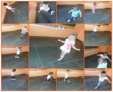 Crianças brincam de andar e equilibrar em cima da letra (A).