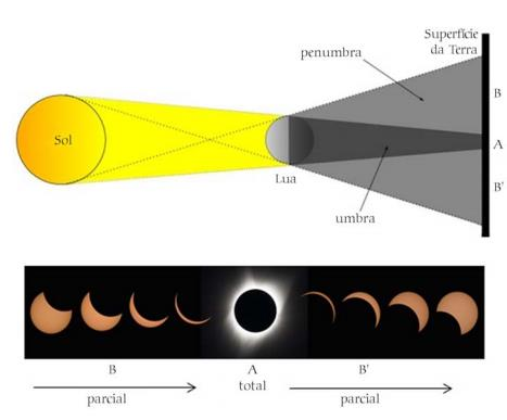 O eclipse é um fenômeno astronômico no qual há escurecimento parcial ou total de um astro devido a um outro corpo que passa a frente de uma fonte de luz, ficando entre essa fonte e o astro “encoberto”. Para um observador na Terra, sob condições ideais de tempo, é possível ver o disco da Lua cobrindo o disco do Sol. Existe duas categorias de eclipses: o solar e o lunar.