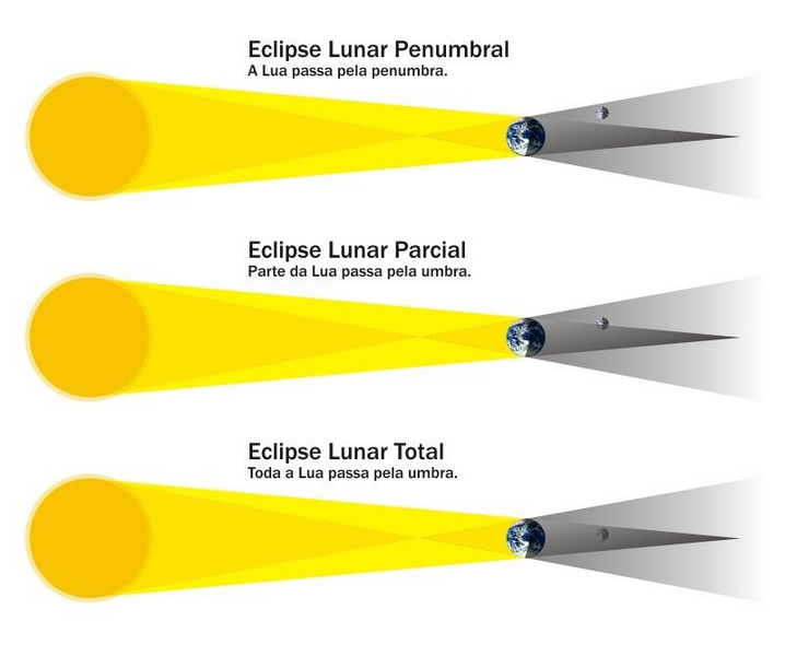 Já o eclipse lunar é mais frequente que o solar, e ocorre quando a Lua entra na sombra da Terra, sendo visível para todos que conseguem ver a Lua naquele instante. Sua duração vai de 1 hora até quase 4 horas (OLIVEIRA-FILHO, SARAIVA, 2020). Existem vários tipos de eclipses lunares: Total, parcial e penumbral, dependendo da região se encontra na sombra da Terra. No eclipse total, a Lua fica completamente imersa na região umbral da Terra, com aparência avermelhada pela luminosidade tênue. Esse efeito se deve porque parte da luz solar é refratada na atmosfera da Terra e reflete na lua principalmente raios na faixa do comprimento de onda do vermelho (OLIVEIRA-FILHO, SARAIVA, 2020). Já no eclipse lunar parcial, apenas parte da Lua fica encoberta pela Terra, e no penumbral, pouco visível a olho nu, a Lua atravessa a região de penumbra da Terra. A figura 3, exposta por Oliveira-Filho e Saraiva (2020) ilustra os tipos de eclipses lunares. A visualização de imagens é essencial para que os estudantes compreendam esse tipo de eclipse e como pode representá-lo através de modelos.
