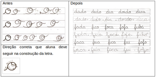 Identificado o erro, orientando-a a seguir a direção da escrita correta da letra, e acompanhando ela nessa construção, a mãe percebeu que a aluna X pode escrever de forma muito mais fluída e legível.