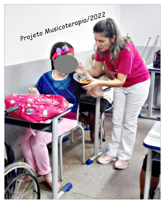 A Musicoterapia é uma ciência voltada para o comportamento e o desenvolvimento do ser humano. Sua atuação dá-se não somente em aspectos reabilitativos, mas também no desenvolvimento de habilidades do indivíduo com necessidades especiais. Um diagnóstico comumente encontrado nas escolas é o atraso do desenvolvimento, definido como um grupo de disfunções com distúrbios essencialmente predominantes na aquisição de competências cognitivas, linguagem, motoras ou psicossociais. Inclui os seguintes diagnósticos: retardo mental, distúrbios específicos do desenvolvimento, transtornos do desenvolvimento e distúrbios de comportamento. Além de proporcionar sensação de bem-estar, a música quando usada como terapia, pode trazer benefícios para a saúde como melhorar o humor, a concentração e o raciocínio lógico. A musicoterapia é uma boa opção para crianças se desenvolverem melhor, tendo uma maior capacidade de aprendizagem. A musicoterapia é uma terapia que utiliza a música no seu contexto clínico como método terapêutico visando à melhora dos problemas do indivíduo. Através do uso da musicoterapia em uma instituição de Educação Especial, acredita-se que o processo realizado com os pacientes é eficaz na socialização dos sujeitos envolvidos no processo, visando à inclusão e participação do indivíduo, proporcionando-lhe um espaço de confiança mútua cujo objetivo no final do processo é a melhora da autoestima, despertando assim desejos e estimulando suas potencialidades. Neste sentido, a musicoterapia trabalha o processo terapêutico favorecendo a minimização das problemáticas do processo inclusivo, fazendo com que este processo se torne mais saudável para o indivíduo e seu grupo social. Portanto, a musicoterapia com educandos participantes da inclusão escolar e de atendimentos educacionais especializados auxilia na promoção da saúde individual e coletiva.